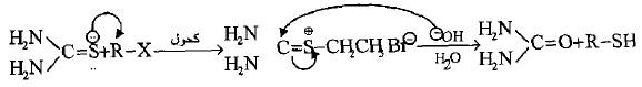 (3) تتفاعل هاليدات الألكيل مع مركب الثايوريا لتكوين أملاح S- الكيل ثيورونيوم تتمتع باستقرارية واضحة ولكنها تتحلل في الوسط القاعدي لإنتاج الثايول المقابل وتكوين اليوريا.