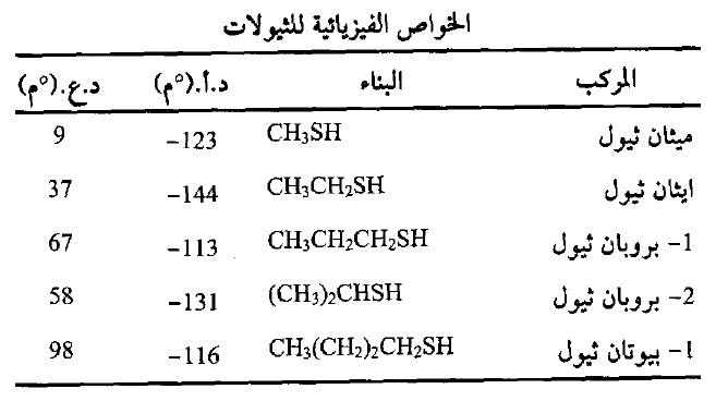 – الثيولات سوائل ذات درجات غليان واطئة لأنها تكون روابط هيدروجينية ضعيفة قياساً بالماء والكحولات.