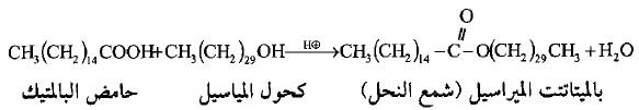 – أهم تفاعل للأحماض الدهنية هو تفاعل الأسترة حيث تتفاعل الحوامض الدهنية المشبعة وغير المشبعة مع الكحولات الأحادية لتكوين الشمع.