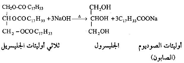 – تتحول الجليسريدات الثلاثية بوجود القاعدة القلوية (هيدروكسيد الصوديوم أو هيدروكسيد البوتاسيوم) وبالتسخين إلى أملاح الحوامض الدهنية (الصابون).