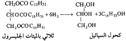 – عند تغير العامل الحفاز في هدرجة الدهون غير المشبعة من فلز النيكل إلى كروميت النحاس (CuCr2O4-CuO) تحت حرارة 150مo وضغط 340 جو فإن الروابط المزدوجة لا تتأثر وإنما تتحول الأستر إلى الجليسرول والكحولات المقابلة للحوامض المتفاعلة في بداية تفاعل الأسترة.